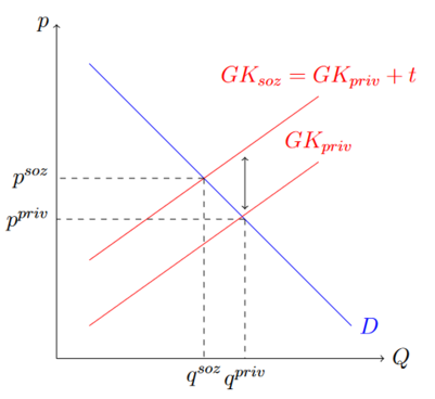 Der SMU (Social Marginal Utility) ist der soziale Grenznutzen. Wie in der Abbildung zu sehen ist liegt die produzierte Menge unter der sozial optimalen Menge . Im Fall von steigenden Grenzkosten lässt sich sehen, dass der tatsächliche Preis unter dem sozial optimalen Preis liegt. Es sind auch Szenrien vorstellbar, in denen der externe Effekt kostant ist. Auch die Grenzkosten könnten theoretisch konstant sein.