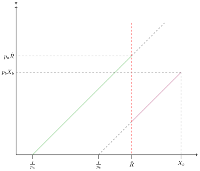 Dies kann durch Umstellen auch grafisch dargestellt werden. Der Gewinn der Bank resultiert bis zu dem kritischen Zinssatz (Grenze in rot dargestellt) von den Zinsersträgen bezahlt durch den erfolg von Projekt A (in grün). Ab einem Zinssatz entschediet sich der Unternehmer für Projekt B und der Gewinn wird durch die lilane Gerade beschrieben. Die Bank sollte einen Zinssatz (oder ganz leicht darunter) wählen, denn liegt der Zinssatz darüber ist der Gewinn geringer oder sogar negativ. Alle diejenige, die ein Kreidt nachfragen, bekommen ihn nur noch zu , sodass der Payoff aller Kreditnachfrager