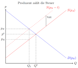 Grafisch wird die Angebotskurve um die Menge der Steuer nach oben verschoben. Intuitiv versteht sich die Mengensteuer als Erhöhung der Produktionskosten um die Mengensteuer. Im Schnittpunkt lässt sich der Konsumentenpreis () finden, der abzüglich der Mengensteuer dem Produzentenpreis entspricht.